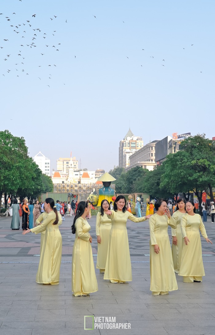 Trong không gian nhộn nhịp của phố đi bộ Nguyễn Huệ, những tà áo dài thướt tha dường như càng làm nổi bật vẻ đẹp mềm mại và đầy nữ tính của người phụ nữ Việt.